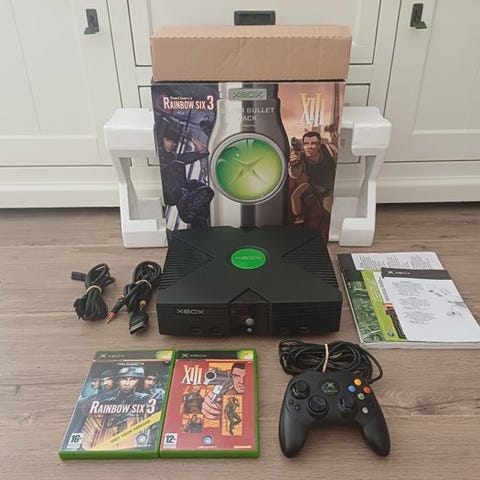 Xbox Crystal Pack, 2001-model, i meget god stand med original emballage, fra en privat samling, inkluderer to controllere og et forbedret SCART-kabel ud over originalen, og det eneste spil er Project Gotham Racing. Klik på den blå "gå til varen" knap, for at købe eller byde på denne vare. Den samlede pris vil blive vist inden du afgiver dit bud.