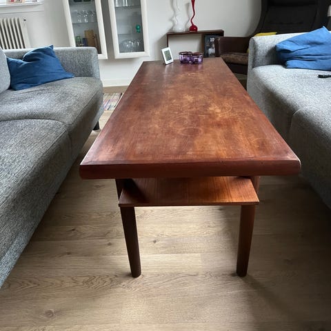 Brugt Retro Sofabord i fineret/massiv teaktræ, hylde under sofabordet