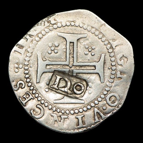 Sølv Tostão (100 Reais) fra D. Filipe III-regimet (1621-1640), præget i Lissabon som POTVGALI, sjælden, vægt 7,85 g og diameter 30,17 mm. Klik på den blå "gå til varen" knap, for at købe eller byde på denne vare. Den samlede pris vil blive vist inden du afgiver dit bud.