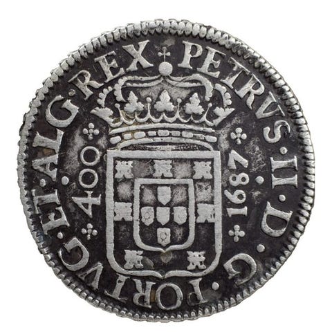 Portugal, 1688 Lisboa sølv Cruzado (400 Reis), sjælden udstedt under D. Pedro II, vægt 16,65 g og diameter 36,28 mm. Klik på den blå "gå til varen" knap, for at købe eller byde på denne vare. Den samlede pris vil blive vist inden du afgiver dit bud.
