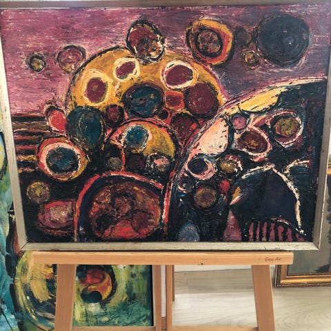 Oliemaleri, Tom Lindhardt , motiv: Fantasy, stil: Modernisme, b: 80 h: 74, FANTASTISK FLOT OLIEBILLED AF TOM LINDHARDT - KLARE DEJLIGE FARVER - MÅL ER M. RAMME kr 3500