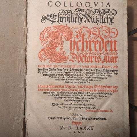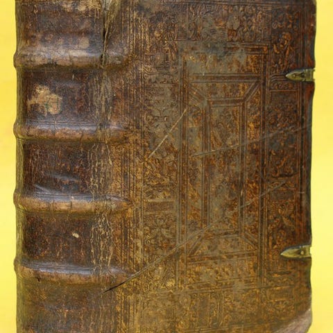 Eksemplar fra det 16. århundrede i vellrelige bindings med lænker, bevaret i en moderne beskyttelsesboks. Værket tæller omkring 850 sider i alt, med titelblad udskåret i træ og illustrationer.