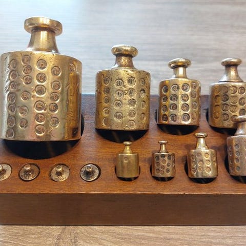 Industrielt udstyr - Vintage messing-vejtevægte til skala med trææske (12 væg...