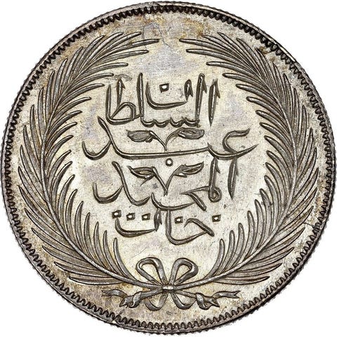 Sølvmønt fra det osmanniske Egypten, der viser i forside den kalligrafiske tughra af sultan Abdul Hamid II, i elegant islamisk stil og flydende penselstrøg, der optager midten af felten med dekorerede elementer. Bagsiden viser den pålydende