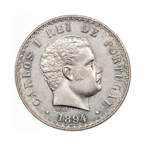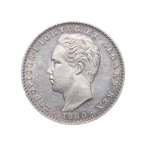 Portugal, sølv 200 Reis mønt fra 1865 med D. Luís I, sjældenhed Rara, vægt 4,93 g, diameter 23,51 mm, ikke vurderet (AG 11.01). Klik på den blå "gå til varen" knap, for at købe eller byde på denne vare. Den samlede pris vil blive vist inden du afgiver dit bud.