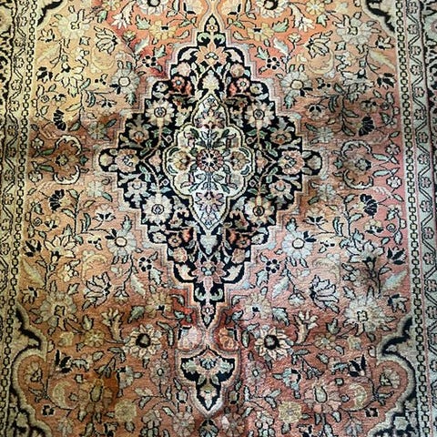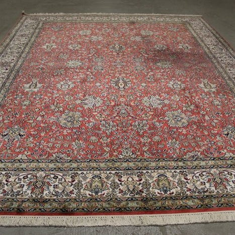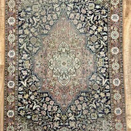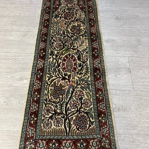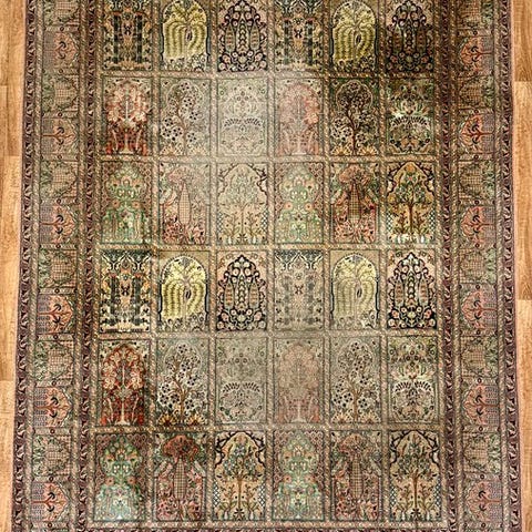 Smukt håndknyttet silketæppe er naturligt farvet uden kemikalier. Hovedfarven er creme, blå, rød, grøn, sort. Tæppet er med en flot professionel, stram knude og korte frynser.