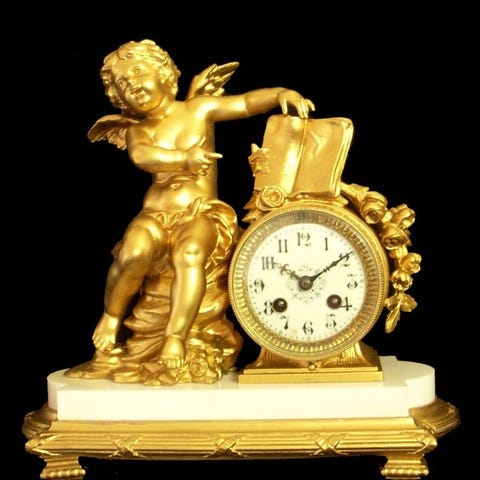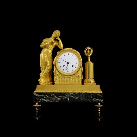 Empire-tidsalder figurativt vægur ur i forgyldt ormolu bronze med marmor, Frankrig ca. 1810, model „Love Letter“, 52 × 47 × 17 cm, 10 kg, mekanisk urværk med 8 dages gangreserve, slår hvert halve time, med optræksnøgle, i god brugt stand og i funktion. Klik på den blå "gå til varen" knap, for at købe eller byde på denne vare. Den samlede pris vil blive vist inden du afgiver dit bud.