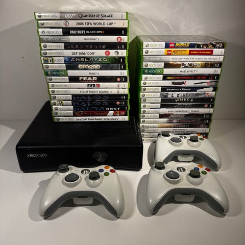 En Xbox 360 Elite, 120 GB, med 2 nye controllere, alle kablerne, i god driftstilstand. De originale æsker er en smule beskadigede. Se billede. Med 49 spil i god stand. Det hele vil blive pakket i bobleplast og en stor papkasse, sendt med Bpost, med et sporingsnummer og en garanti. Kassens vægt 14 kg. Længde 59 cm. Bredde 42 cm. Højde 27 cm.