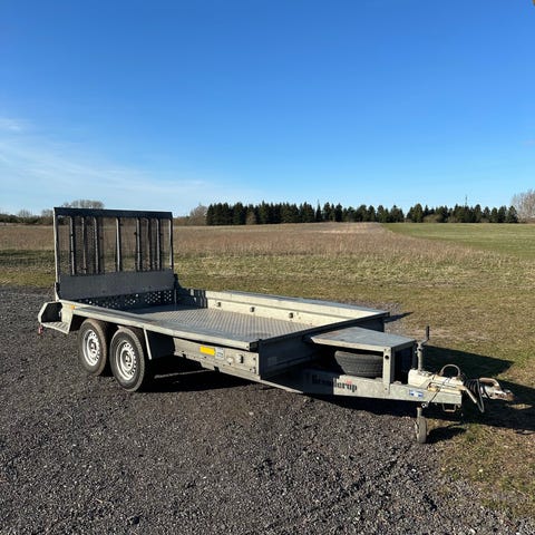 Velholdt trailer med rampe, tidligere brugt til at transportere motocross maskiner. Det er bespændinger i bunden til fastgørelse.