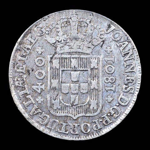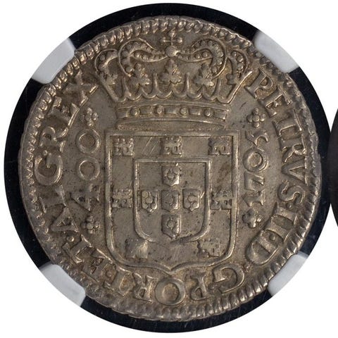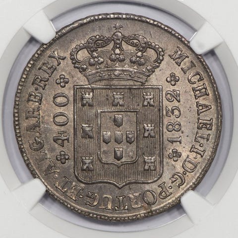Portugal, 1819 Cruzado Novo (400 réis) sølvmønt, præget under D. João VI, sølv 916,6 %, vægt 14,68 g, diameter 35,00 mm, NGC MS61 (certifikationsnr. 6028043004). Klik på den blå "gå til varen" knap, for at købe eller byde på denne vare. Den samlede pris vil blive vist inden du afgiver dit bud.