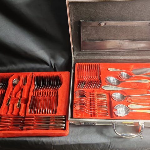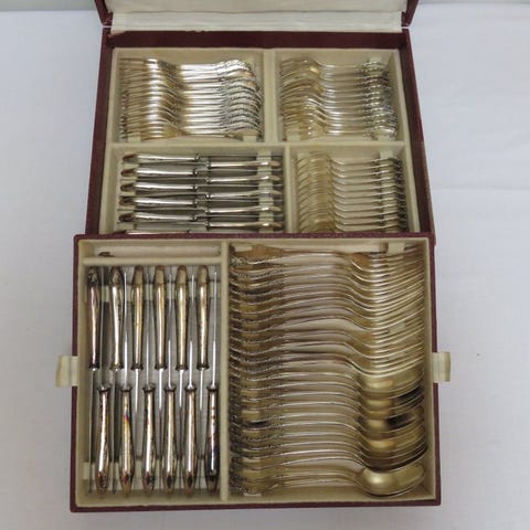 Det drejer sig om et komplet sæt bestående af seks knive (ca. 18,5 cm, 31 g), seks gafler (ca. 16,5 cm, 24 g), en palet (ca. 28,5 cm, 93 g), en kniv (ca. 25,5 cm, 69 g) og en ske (ca. 18 cm, 55 g) til desserter, kager og is, alle i Solingen-stål, aldrig brugt. Palet og kniv er indgraveret med et elegant dekor, mens alle håndtagene er belagt med en sølvfolie af 800 finhed dekoreret med et klassisk engelsk mønster. Det hele præsenteret i sin originale to-etagers æske i grøn farve, hvor det også står trykt på det indvendige stoffor, for også titlen på sølvet; Desuden giver vi som gave et sæt af seks skeer (ca. 16 cm) og en serverske (ca. 23 cm) i Solingen-stål, elegant indgraveret og med håndtag belagt med sølvfolie af 800 finhed til desserter, kager og is i sin originale blå æske; antikke artikler aldrig brugt i deres originale emballage;