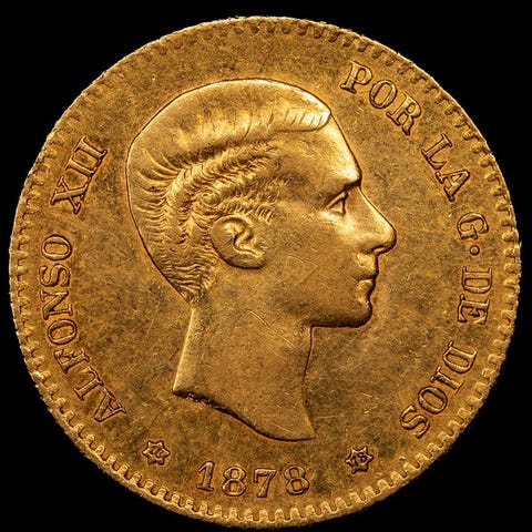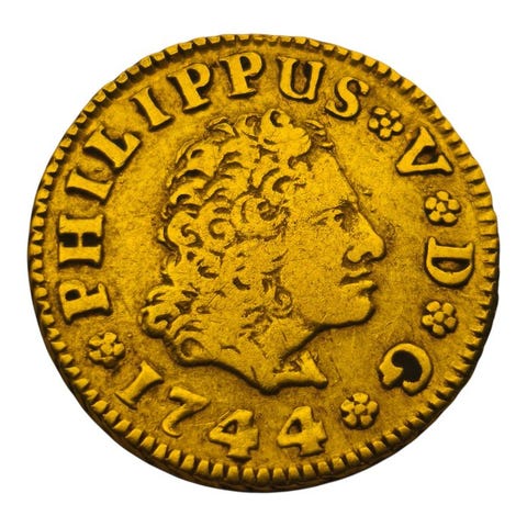 Spansk guldmønt af Felipe V, 1/2 Escudo, møntsted Madrid, år 1744, vægt 1,76 g, diameter 14,64 mm, tilstand uden certifikat. Klik på den blå "gå til varen" knap, for at købe eller byde på denne vare. Den samlede pris vil blive vist inden du afgiver dit bud.