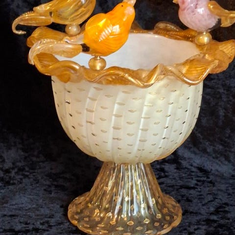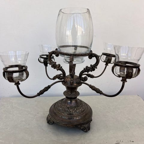 Dette er en smuk bordkandelaber. Meget smukt lavet af en bronze/messinglegering og afsluttet med smukke porcelænsfugle (parakitter). Kandelaberen er udstyret med to lysestageholdere og er designet som en gren med blade. Meget smuk og rigtig flot som bordpynt.