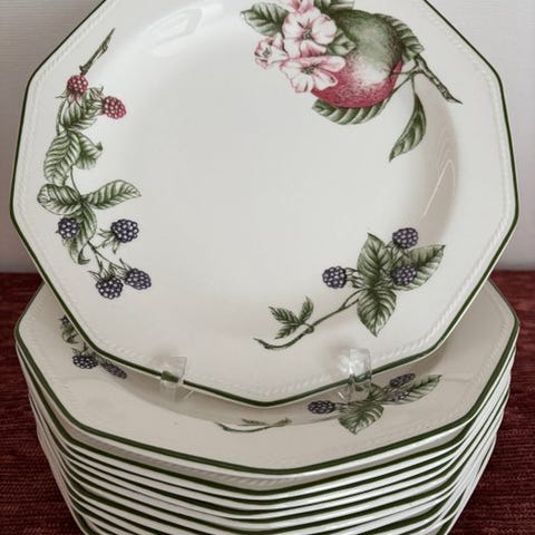 Dekoren er levende og farverig, med et mønster af frugt og blade.