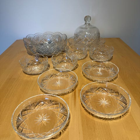 til salg står et omfattende udvalg af høj-kvalitets blykrystal, bestående af ni skåle, en dekorativ glasglocke samt en hankelskål. Genstandene imponerer med deres præcise facetsnit og den klare lysbrydning.