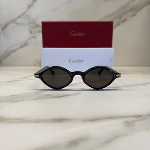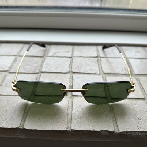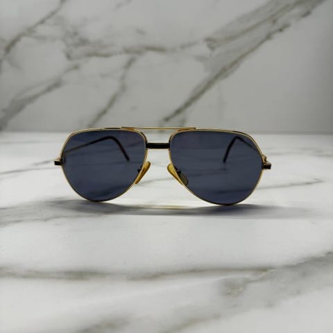 Produktet er et par solbriller uden stel Cartier med en metalleramme guldbelagt 22 karat, kendetegnet ved Cartier-logoen C.