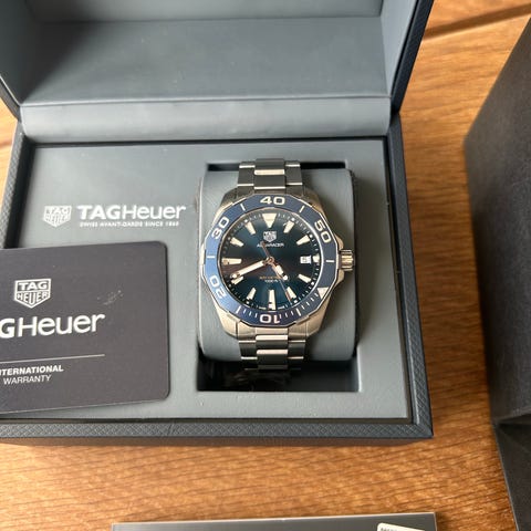 TAG Heuer Aquaracer 300M Calibre 5 Blue Automatisk, Ref. WAY201P, 43 mm stål kasse, blå urskive med blå og sort bezel, gummirem, herreur i god stand med synlige brugsspor. Klik på den blå "gå til varen" knap, for at købe eller byde på denne vare. Den samlede pris vil blive vist inden du afgiver dit bud.