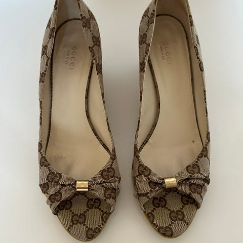 Originale Gucci-sandaler med kilehæl, lavet i det karakteristiske GG-stof i beige ebony og med inderside i nappa i farven Charlotte, ahorn.