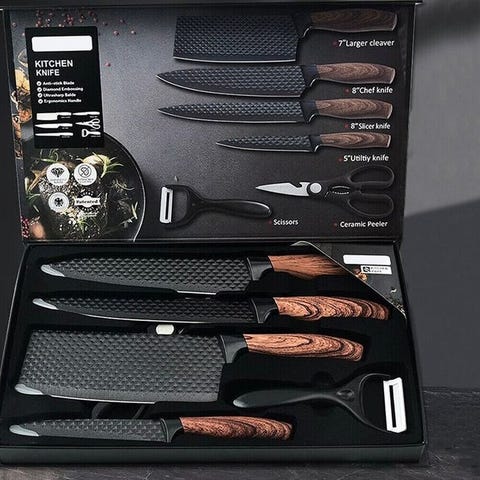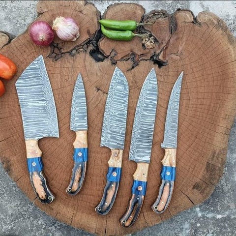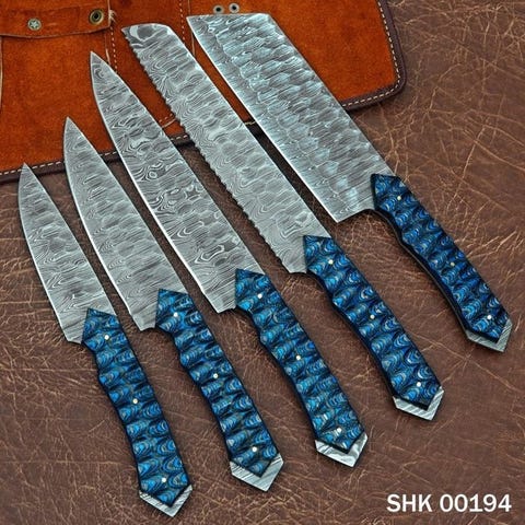 Disse knive er lavet af lav- og højkulstof Damascus-stål, ikke rustfrit stål. Du kan ikke vaske dem med vand og sætte dem tilbage i kassen. Du skal vaske dem med vand, tørre dem, SÅ PÅFØRE vegetabilsk olie, før du sætter dem tilbage i kassen.