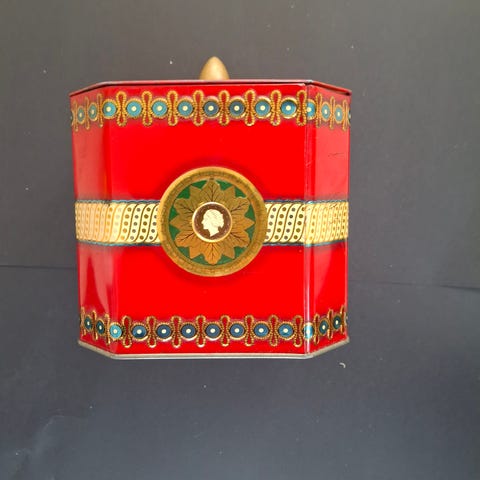 Den har et elegant ben i guldfarve og rødt.