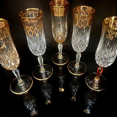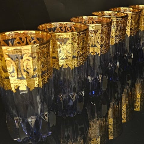 Smukke farvede champagneglas i viola-farve, vidunderligt udskårne og hånddekorerede, unikke i deres slags, færdiggjort med store og værdifulde 24 kt gulddekorationer, skåret i relief, i autentisk muranisk stil.