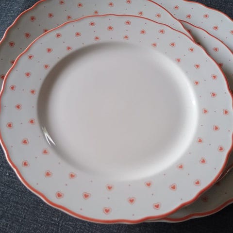 Serveret bestående af 4 bundeskuffer (fødder), 4 flade tallerkener og 4 desserttallerkener