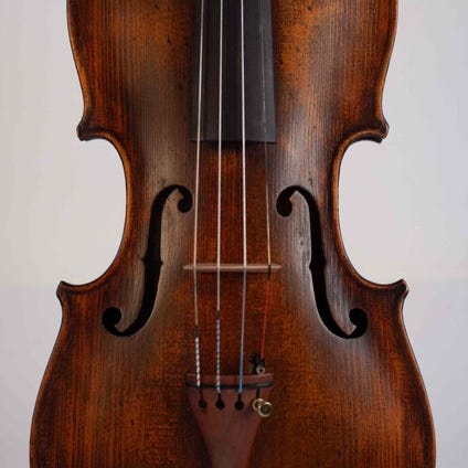 Violen har et fremragende top af høj- til mellemgrenet gran og to stykker bagstykke af blødt flammeret ahorn med matchede sider og gravering/scroll. Purflingen er professionelt udført, og kanterne er mesterligt udførte. Den samlede længde af violinen er 590 mm og bagstykket 357 mm. Bredde af øverste buer: 167 mm; midterste buer: 114 mm; nederste buer: 206 mm. Tøv ikke med at kontakte