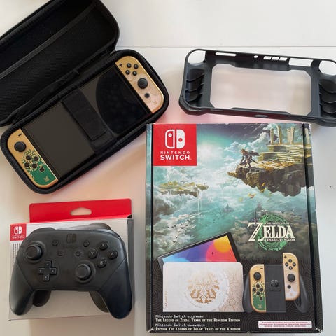 Fremragende Nintendo Switch OLED Zelda-udgaven, komplet og i stand nærmest som ny, hvad enten det gælder boksen eller hele sættet og dets indhold. Skærmen har ingen ridser.