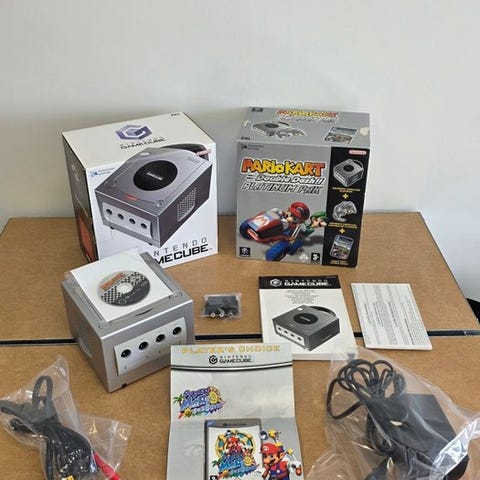 Et tiltalende tidligt 2000-tals Nintendo GameCube-parti, præsenteret med konsollen, matchende controller, dedikeret GameCube bæretaske, AC-adapter og en kopi af Super Smash Bros. Melee på mini-disc.