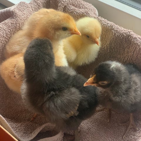 Orpington skruk med sine 12 kyllinger. Hun er en dygtig og rolig skruk, som passer godt på sine ‘børn’. Familien passer sig selv så der er ikke brug for varmelampe eller lignende. Du skal kun give dem vand og foder.