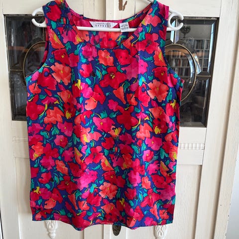 Custommade top til kvinder i str. S. Ærmeløs model i silke (mit bud) med lodret stribet mønster. Toppen har rund halsudskæring med volantdrapering foran. Materialet er let og glat, egnet til både hverdagsbrug og mere formelle anledninger afhængigt af styling.