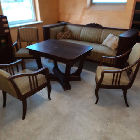 Vintage sofa- og lænestolssæt med sofabord i træ