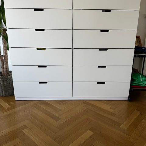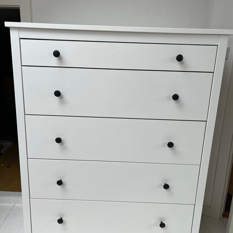 Koppang kommode fra IKEA med fem skuffer, måler 90x44x114. Er kun blevet brugt til tøj og fremstår derfor som ny. Skal bæres ned fra 3. sal, men er relativt let, når skufferne tages ud.