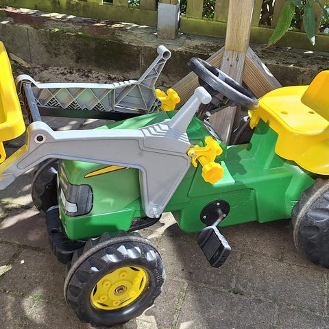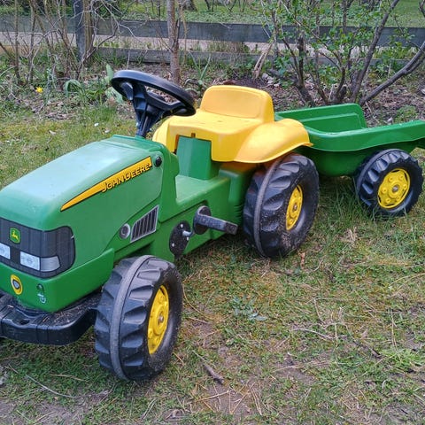 En John Deere traktor med vogn og en Claas traktor med vogn. Falmet af solen og trænger til en ordentlig rengøring, men der er mange gode timers leg tilbage i dem endnu. Børnene er vokset fra dem og vil gerne have pengene til sparegrisene. De fejler ingenting udover farven.