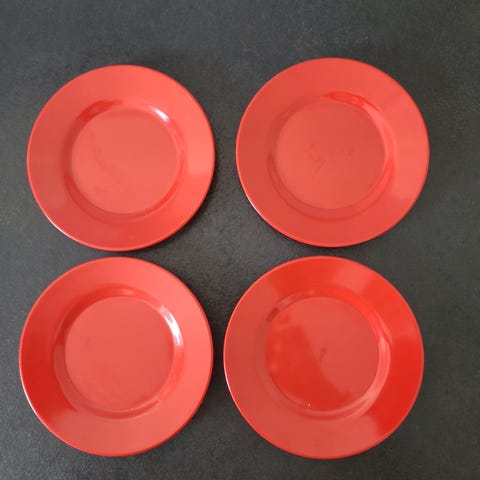 Klassiske Georg Jensen tallerkener i rød melamin. Designet af Henning Koppel. Stemplet på bagsiden med Georg Jensen Design Denmark og modelnummer 4002. Diameter: 29 cm. God stand. Pr. stk. 75 kr.