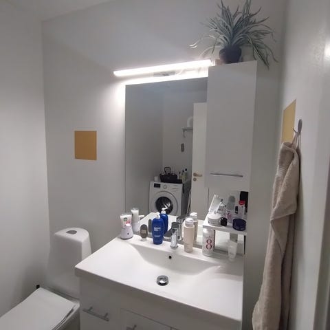 Købt i “Bad & Fliser” og opsat før opstart på renovering af badeværelse, hvorfor det IKKE står op af væggen på billederne.