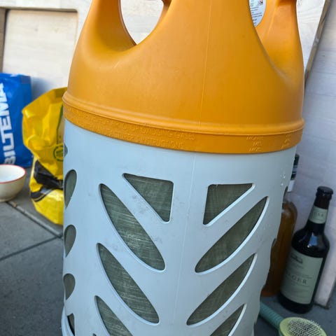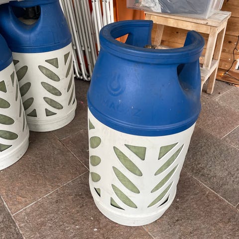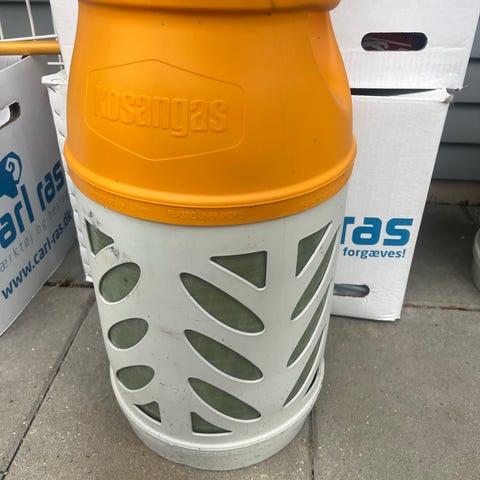 Jeg har denne nye 10 kg letvægtsflaske fyldt med gas og plumbering. Letvægtsgasflaske i komposit.
