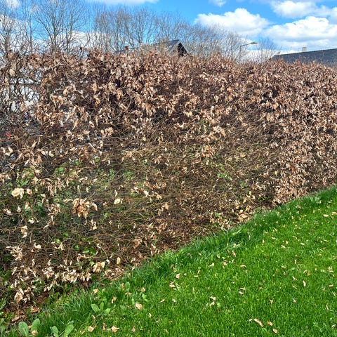 Bøgehæk planter velegnet som hæk langs indkørsel, have eller skel. Planterne står i række og fremstår med visne blade på billederne, men er flerårige løvfældende hækplanter, der typisk springer ud igen i vækstsæsonen. Egner sig til tæt hæk, når de plantes med passende afstand og passes med vanding og beskæring. Skal selv graves op