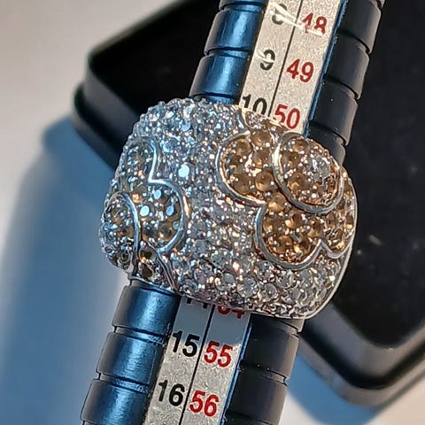 Ringen er fremstillet i 925 sterlingsølv og har et bredt design med lyse lilla sten og klare sten i et mønster på forsiden. Indvendigt er ringen stemplet med 925 samt mærket "Zenana".