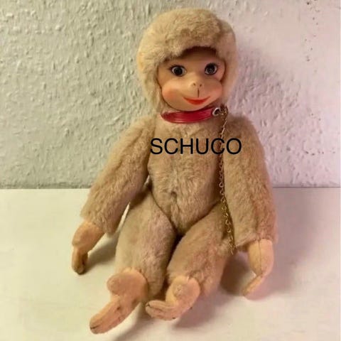 Bamse abe plysdyr i beige plys med blød krop og plastikansigt. Legetøjet forestiller en abe med arme og ben, der kan bevæges. Egnet som krammebamse eller som pynt på børneværelset.