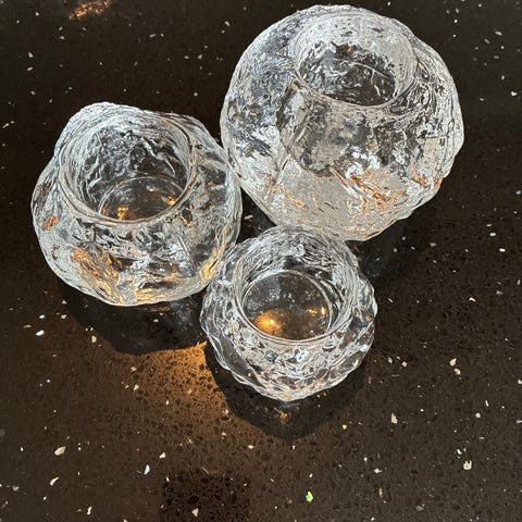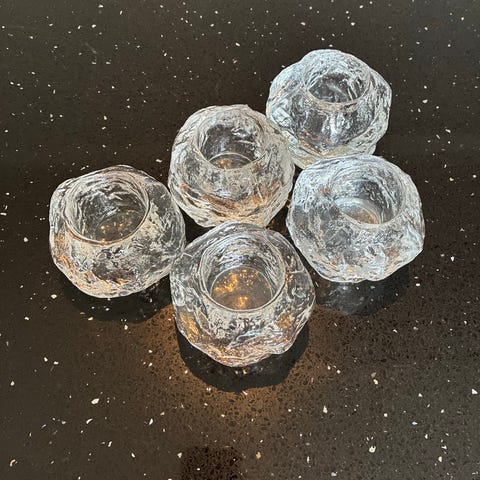 2 stk. (1 lille og 1 mellem) Kosta Boda Snowball fyrfadsstager i klart glas. Sæt med to stager i organisk, is-lignende struktur. Velegnet til fyrfadslys og som dekorative glasobjekter i hjemmet, f.eks. på bord, hylde eller vindueskarm.