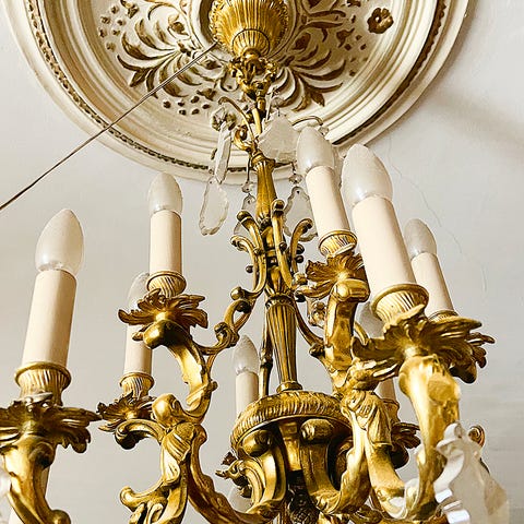 Stor lysekrone, der trænger til en kærlig hånd. Mangler nogle prismer - deraf den billige pris. Sælges som beset