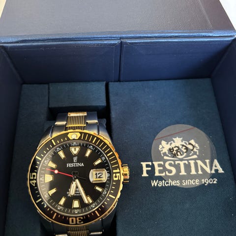 Tissot Seastar 1000 dameur med 36 mm urkasse. Uret har sort urskive med datoangivelse og tydelige timemarkeringer. Bezel og midterled på lænken er guldfarvede, mens resten af kassen og lænken er i rustfrit stål i sølvfarve. Lænken er i metal med foldelås, og der medfølger ekstra led til justering af længden. Uret er designet til kvinder og leveres i original Tissot-æske med tilhørende dokumenter. Nypris i dag 3.895 kr.
