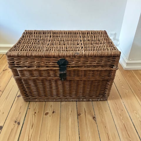 Gammel kiste i flet, tydelig brugsspor, men bestemt stadig pæn og brugbar.