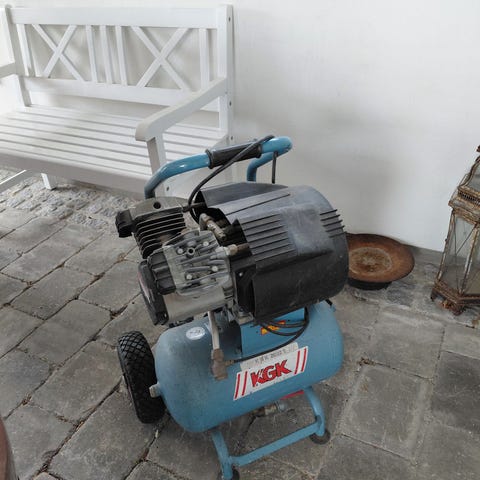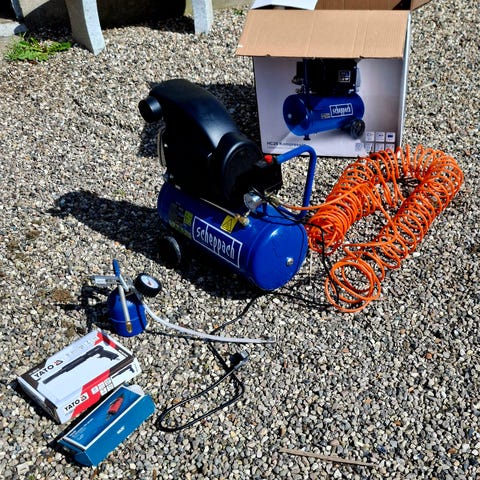 Kompressor sælges med forskelligt tilbehør. Fungerer upåklageligt. Kræver stærk strøm.