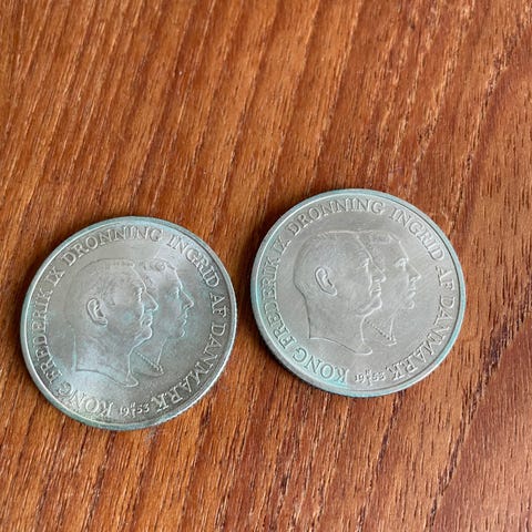 Grønlandsk mønt erindringsmønt 1953. Ikke ligget i beskyttet i pose, så trænger til en pudsning, ellers fin og ubrugt.