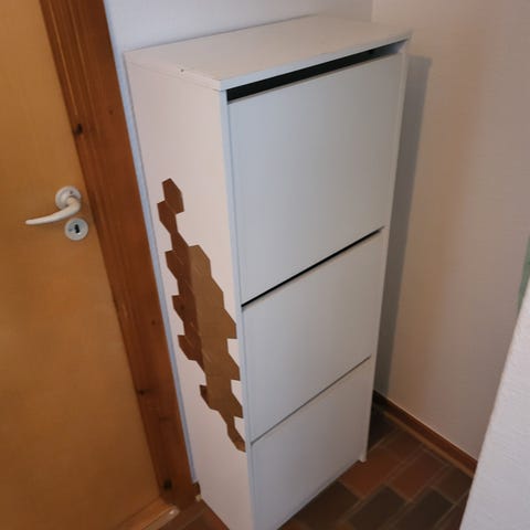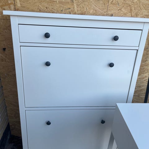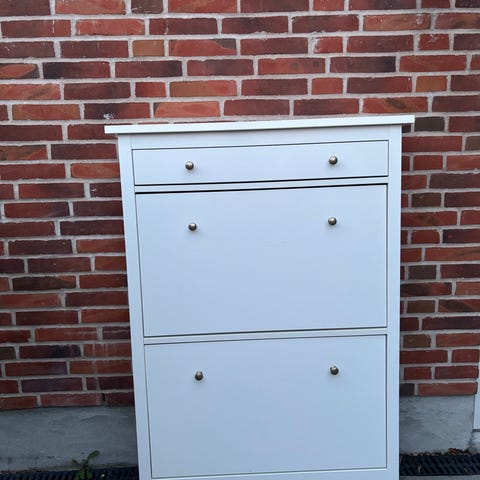 Rummeligt skoskab med to store rum til sko ( ca. 12 par) og en skuffe øverst til nøgler og andet dims.
