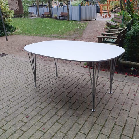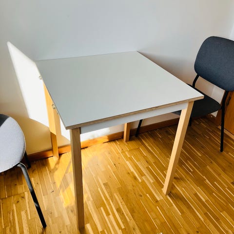 Vedligeholdt. Enkelte ubetydelige ridser i bordpladen. Stålben. Højden kan justeres.