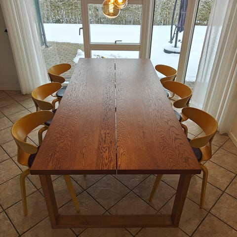 Unikt Friis og Molkte bord, designet til Skjoldhøj kollegiet i massiv bøg (laminat på toppladen) - mål h*b*l: 70 x 85 x 150 com - patina og mindre brugsskader