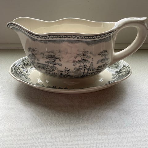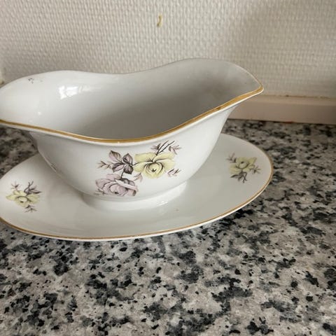 Arabia sovsekande med underfad i hvidt porcelæn med flerfarvet blomsterdekoration og guldkant. Klassisk, buet form med hank og bølget kant på både kande og fad. Velegnet til servering af sauce eller sovs ved borddækning. På billederne ses et mindre afslag på kanten. Arabia-stempel på undersiden.produceret mellem 1932-49